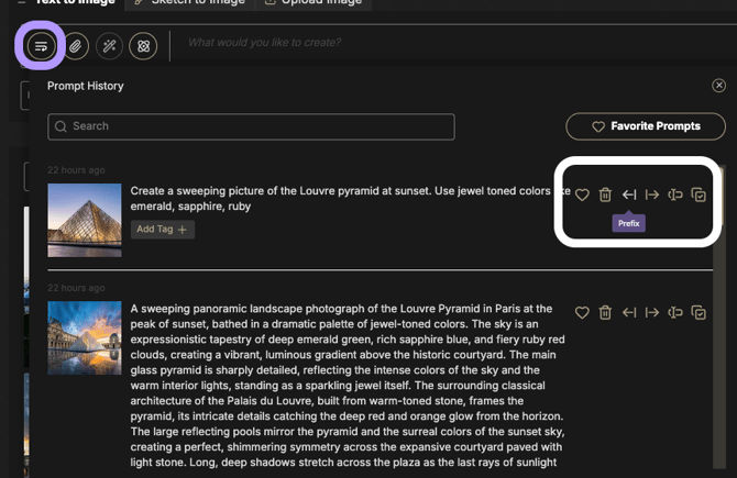 - Modularize and Inject Snippets: Use the Prefix and Suffix tools in the Prompt History to share successful subject or style descriptions as modular snippets that the team can inject into new processes.