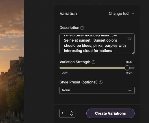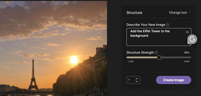 - Establish Structural Guidance: Navigate to the Structure tab to enforce the exact positioning and scale of your subject . Enter a specific text description in the Describe Your New Image field to guide the spatial arrangement without manual drawing. Adjust the Structure Strength slider to set how closely the new generation follows this structural layout.