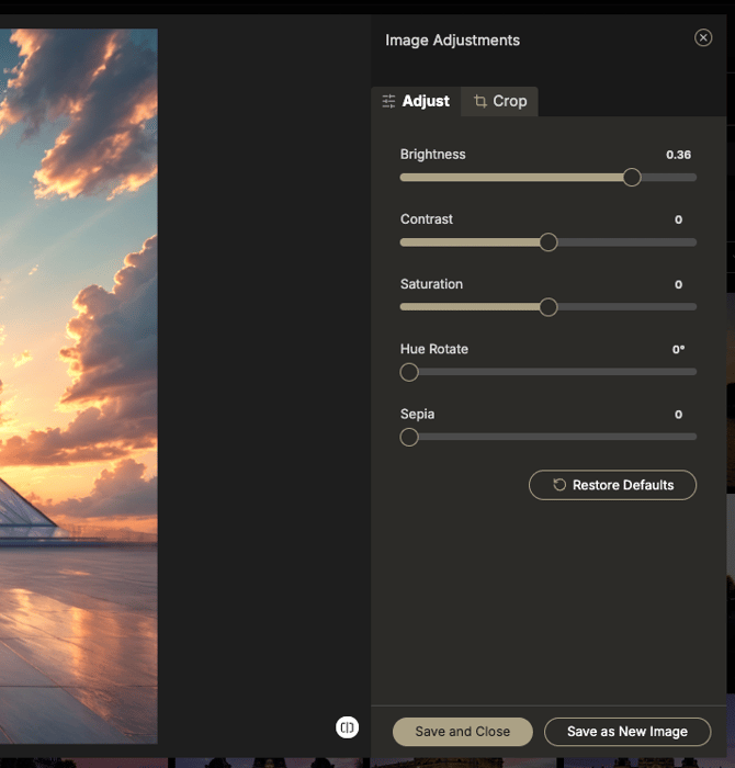 - Fine-Tune with Image Adjustments: Use the Image Adjustments panel to manually harmonize your final result. Adjusting sliders for Brightness, Contrast, and Saturation allows you to blend a subject into its environment with higher precision than relying on the initial generation alone.